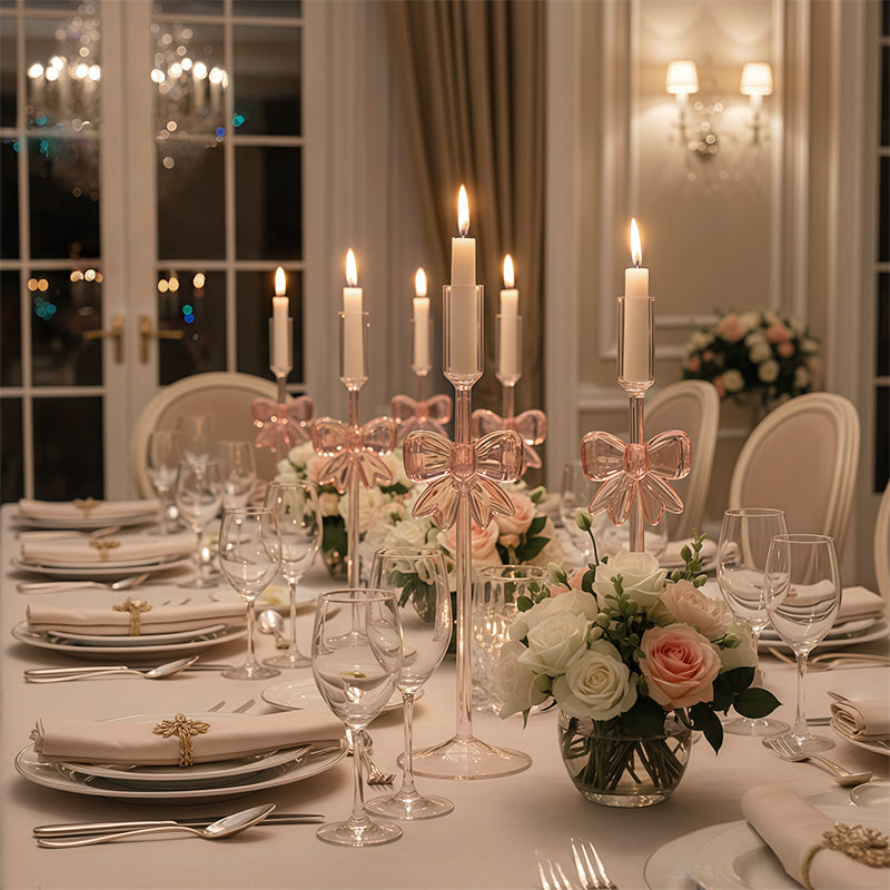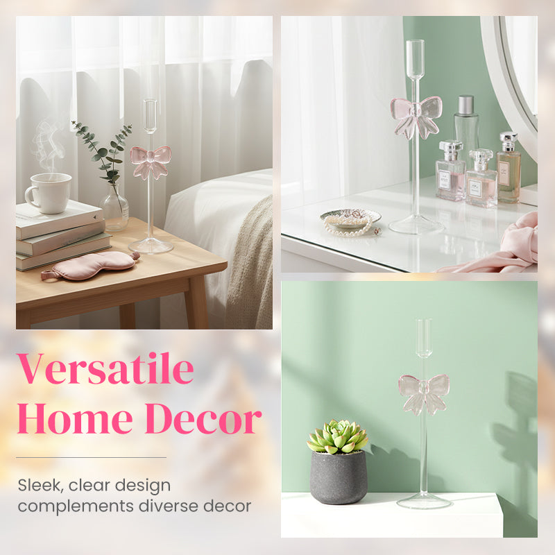 ELEGÁNS MASNI DIZÁJN: Díszítse otthonát szeszélyes kifinomultsággal. A gondosan kidolgozott rózsaszín masni, amely tökéletesen illeszkedik az átlátszó üvegbe, elbűvölő középpontot képez. Ez a finom részlet emeli a gyertyatartót egyszerű kiegészítőből kiemelkedő darabgá, melegséget és karaktert adva minden szobának és alkalomnak, tükrözve a kifinomult ízlést.