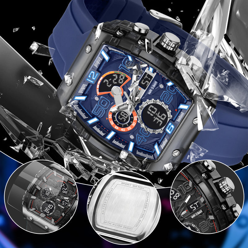 ÜTÉSÁLLÓ ÉS ESÉSBIZTOS KIVITEL: Erős külső héjjal és ütéselnyelő anyagokkal készült, ez az óra ellenáll a rezgéseknek, a hirtelen eséseknek és a véletlen ütéseknek. Ideális sportoláshoz, szabadtéri tevékenységekhez vagy aktív életmódot folytatók számára.